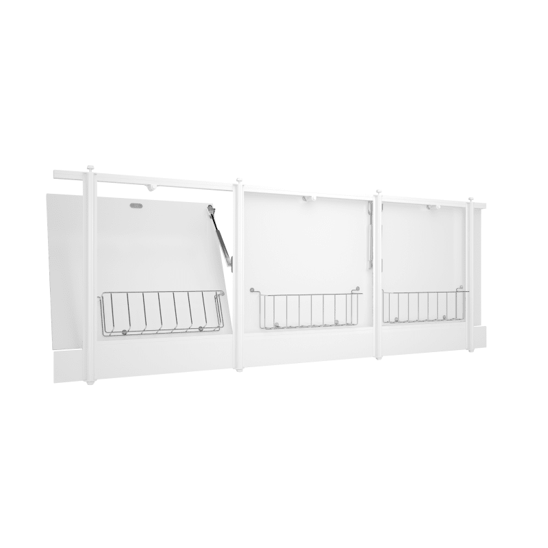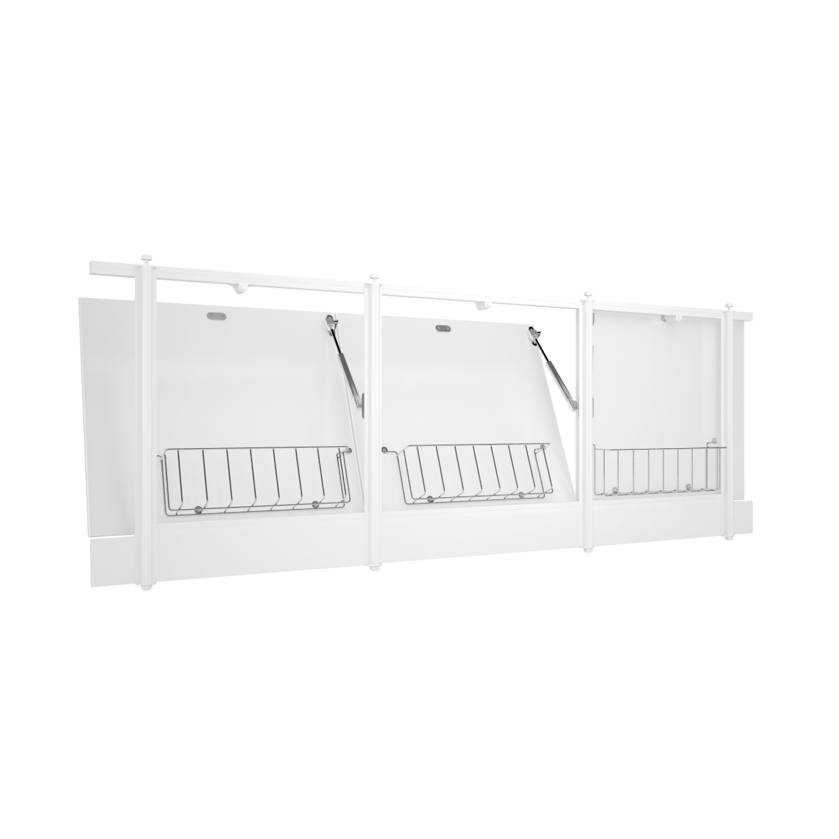 Состав комплектарама состоит из алюминиевого профиля с полимерным покрытием, дверцы экрана изготовлены из ударопрочной ПВХ панели белого цвета, комплект фурнитуры