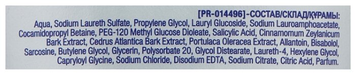 - Состав aqua, sodium laureth sulfate, propylene glycol, lauryl glucoside, sodium lauroamphoacetate, cocamidopropyl betaine, peg - 120 methyl glucose dioleate, salicylic acid, cinnamomum zeylanicum bark extract, cedrus atlantica bark extract, portulaca oleracea extract, allantoin, bisabolol, sarcosine, butylene glycol, glycerin, polysorbate 20, glycol distearate, laureth - 4, hexylene glycol capryloyl glycine, sodium chloride, disodium edta, sodium citrate, citric acid, parfum