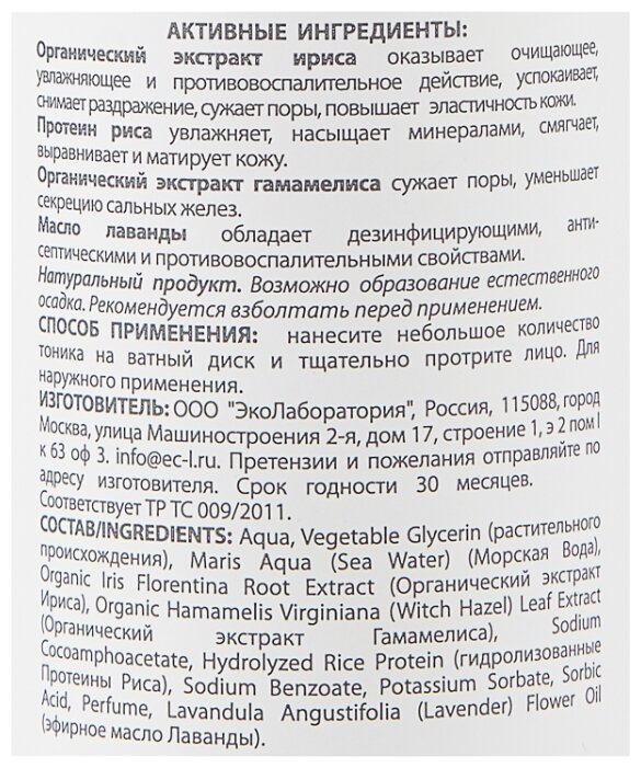 - Состав aqua, glycerin, sea water (морская вода), organic iris extract (органический экстракт ириса), organic salvia extract (органический экстракт гамамелиса), sodium cocoamphoacetate, hydrolyzed rice protein (протеин риса), lavandula essential oil (масло лаванды), sodium benzoate, potassium sorbate, sorbic acid, perfume