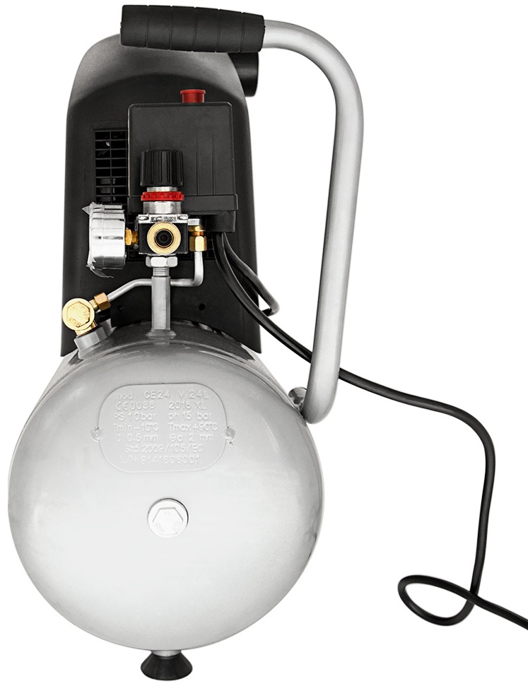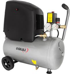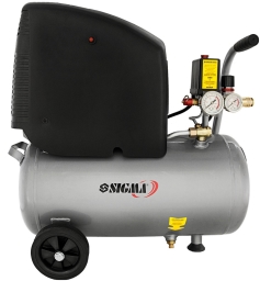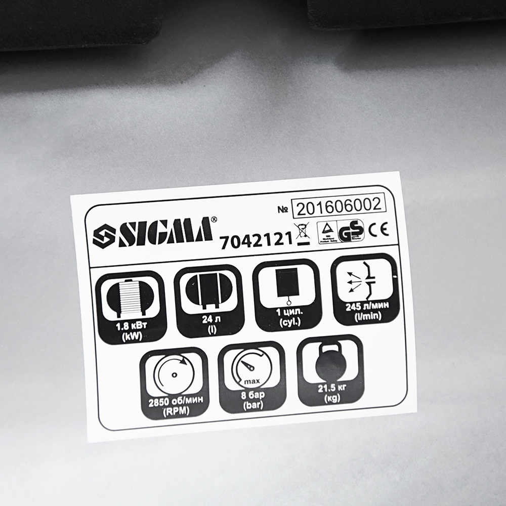 Sigma 7042121 – это компактный компрессор, работающий без масла. Благодаря этому спектр выполняемых с его помощью операций расширяется. Это один из лучших вариантов для соединения с краскопультом, ведь масляных пятен точно не будет. Устройство используют и для работы пневматического инструмента. Стабильное его функционирование обусловлено встроенным 24 л ресивером. В нем происходит сжатие воздуха и последующая подача, что позволяет двигателю отдыхать.