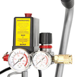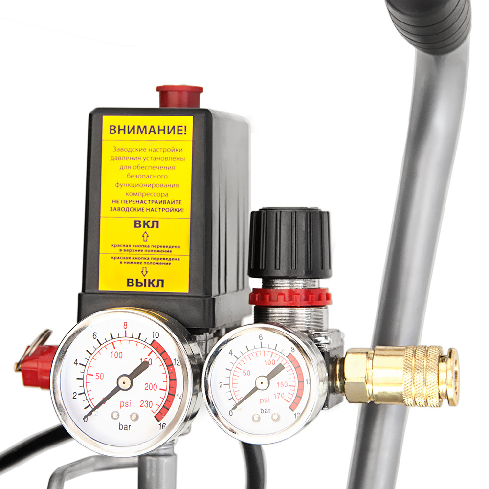 оснащен двумя манометрами для постоянного контроля давления на выходе и внутри бачка;