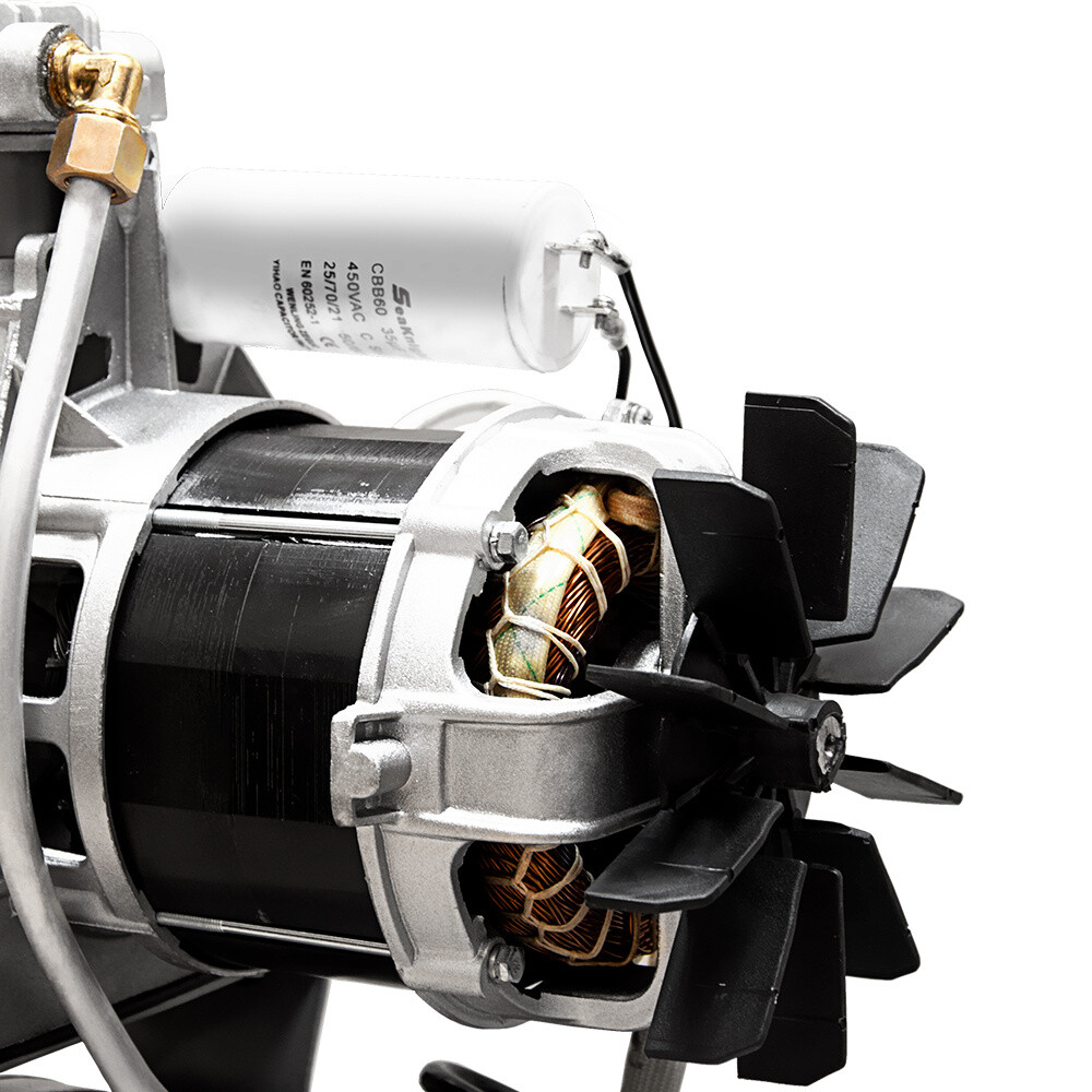 кожух из пластика защищает электромотор от повреждений, грязи, пыли и влаги, а за счет перфорации происходит охлаждение;