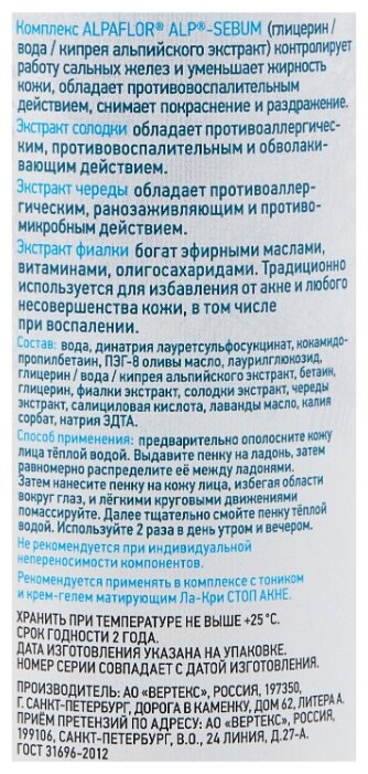 - Состав вода, динатрия лауретсульфосукцинат, кокамидопропилбетаин, ПЭГ-8 оливы масло, лаурилглюкозид, глицерин / вода / кипрея альпийского экстракт, бетаин, глицерин, фиалки экстракт, солодки экстракт, череды экстракт, салициловая кислота, лаванды масло, калия сорбат, натрия ЭДТА