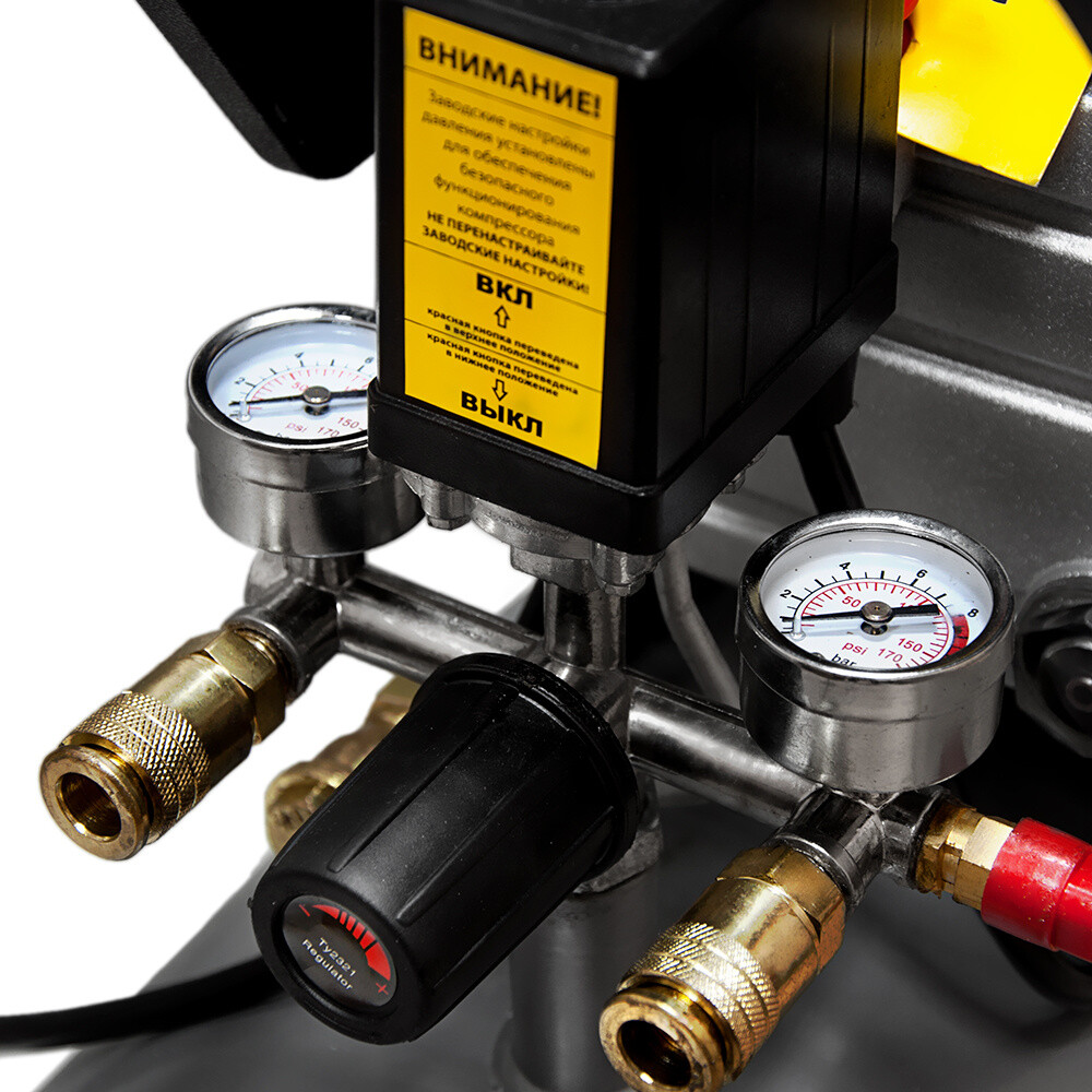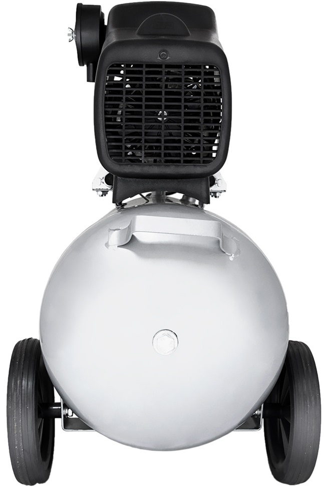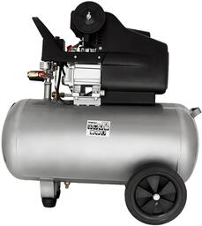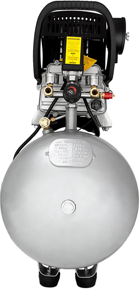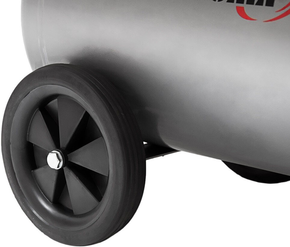 50-литровый металлический ресивер гарантирует стабильную подачу сжатого воздуха, а для слива конденсата оснащен специальной пробкой;