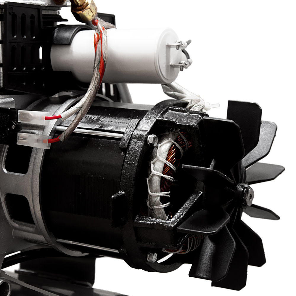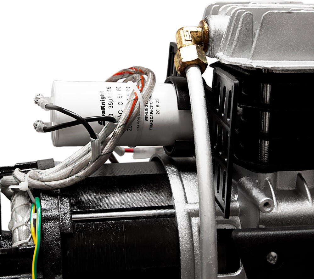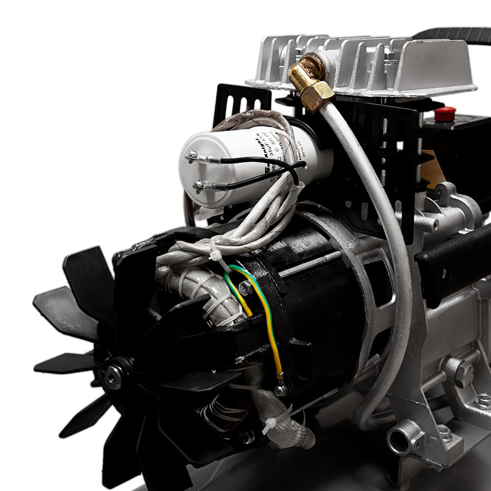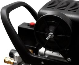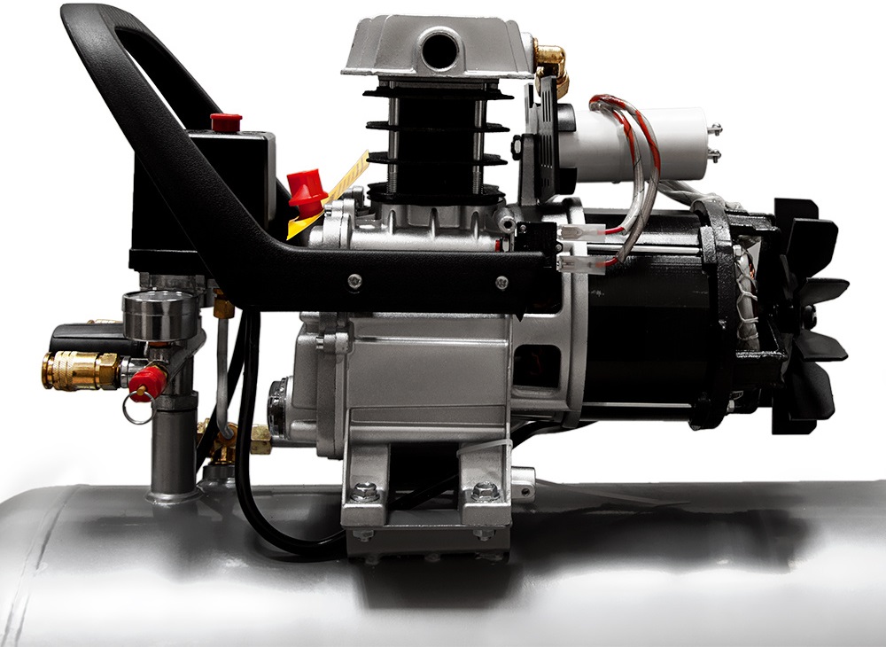 50-литровый металлический ресивер гарантирует стабильную подачу сжатого воздуха, а для слива конденсата оснащен специальной пробкой;