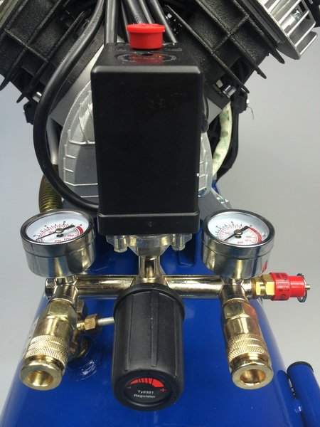 Для визуального контроля оператора на устройстве находятся два манометра. По первому отслеживается уровень выставленного давления, по второму можно контролировать текущее давление в ресивере. В данной модели установлен редуктор давления. Он необходим для корректировки давления под каждый конкретный инструмент с пневматическим двигателем. Необходимый параметр потребления выставляется мастером.