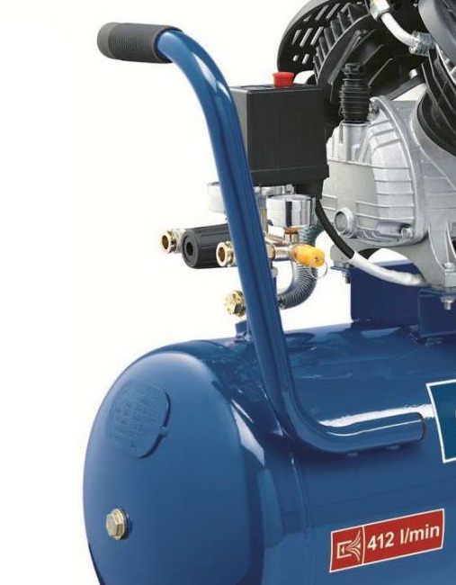 Электродвигатель немецкого производства с потребляемой мощностью 220 Вт способен обеспечить производительность 412 л/мин. Этот показатель уже ближе к профессиональным агрегатам. Электромотор подключается к обычной электросети с напряжением 220 В и не требует дополнительной трехфазной проводки. Максимальное давление в 8 бар соответствует для подключения, практически, всех бытовых инструментов любительского класса. Благодаря прямому приводу, то есть прямого соединения вала и электродвигателя, обеспечивается максимальная производительность с самым малым потреблением электроэнергии. Высококачественные механизмы способствуют увеличенному рабочему ресурсу и стабильной работе аппарата. Длительной эксплуатации способствует принудительное воздушное охлаждение, благодаря которому удерживается правильный тепловой баланс.