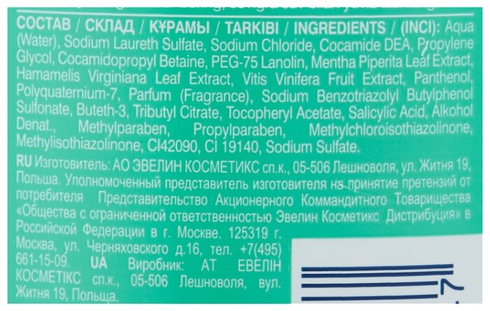 - Состав aqua, (water), sodium laureth sulfate, sodium chloride, cocamide dea, propylene glycol, cocamidopropyl betaine, peg-75 lanolin, mentha piperita leaf extract hamamelis virginiana leaf extract, vitis vinifera fruit extract, panthenol polyquaternium-7, parfum (fragrance), sodium benzotriazolyl butylphenol sulfonate, buteth-3, tributyl citrate, tocopheryl acetate, salicylic acid, alkohol denat., methylparaben, methylisothiazolinone, c142090, ci 19140, sodium sulfate