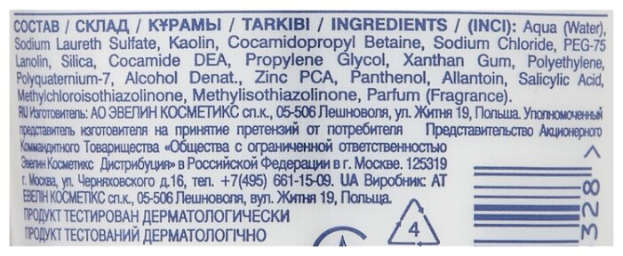 - Состав aqua (water), sodium laureth sulfate, kaolin, cocamidopropyl betaine, sodium chloride, peg-75 lanolin, silica, cocamide dea, propylene glycol, xanthan gum, polyethylene, polyquaternium-7, alcohol denat., zinc pca, panthenol, allantoin, salicylic acid, methylchloroisothiazolinone, methylisothiazolinone, parfum (fragrance)