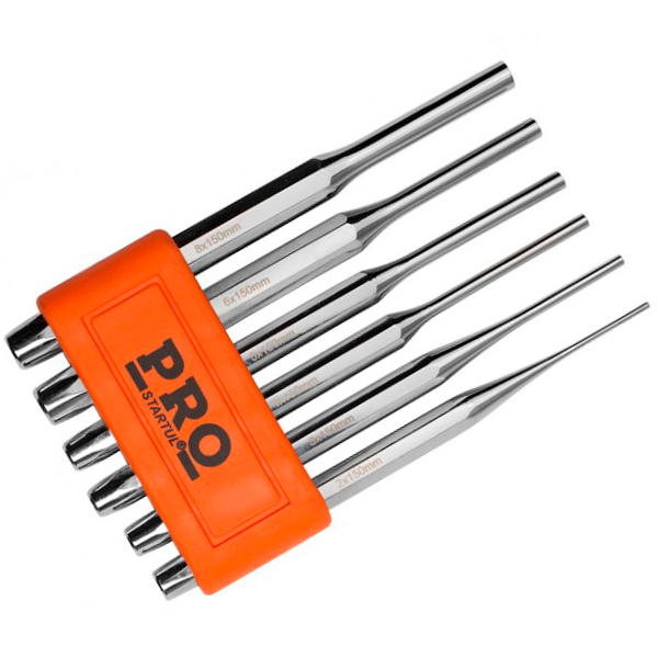Набор выколоток PRO STARTUL PRO-6063 оснащен удобным держателем и состоит из 6 инструментов длиной 150 мм. Диаметр цилиндрических наконечников составляет 2 мм, 3 мм, 4 мм, 5 мм, 6 мм и 8 мм.