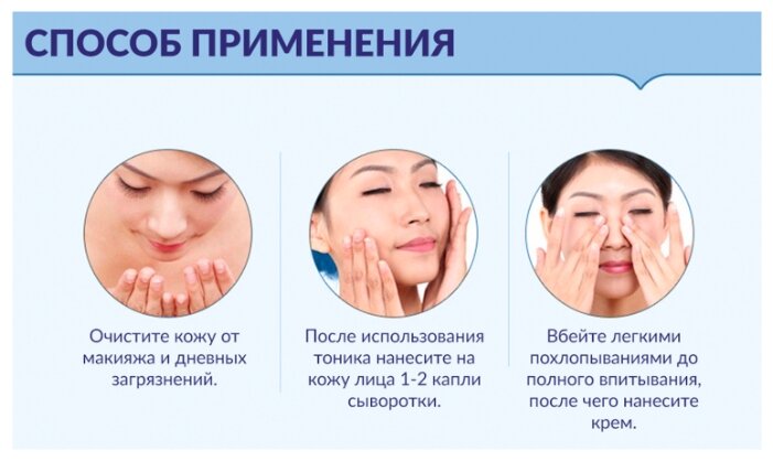 Способ примененияпосле использования тоника нанесите на кожу лица 1-2 капли сыворотки; при необходимости используйте пару капель дополнительно на проблемные зоны; вбейте легкими похлопываниями кончиков пальцев сыворотку в кожу лица до полного впитывания, после чего нанесите крем