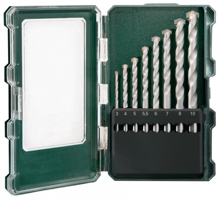 Набор сверл Metabo 626706000 Используется с ударными и безударными дрелями для сверления камня, кирпича Особенности: Диаметр: 3 / 4 / 5 / 5.5 / 6 / 7 / 8 / 10 мм