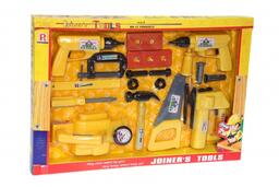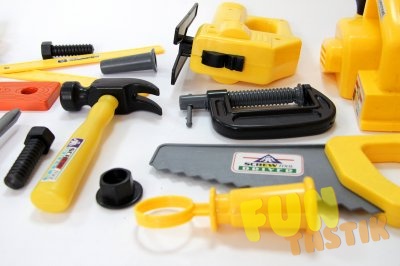 В наборе 18 элементов ( молоток, пила, дрель, рубанок, болты, гайки и прочие инструменты).