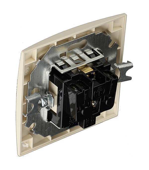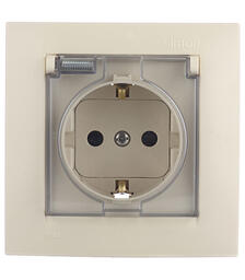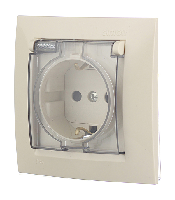 Розетка Simon 15 Schuko моноблок с/у с заземлением со шторками с крышкой IP44 16А слоновая кост