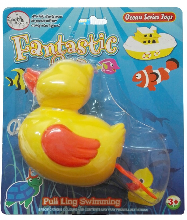 Уточка оснащена специальным механизмом при помощи которого может плавать. На груди уточки есть веревочка с кольцом, которая приводит в действие ее лапки, за счет этого онак может плыть.