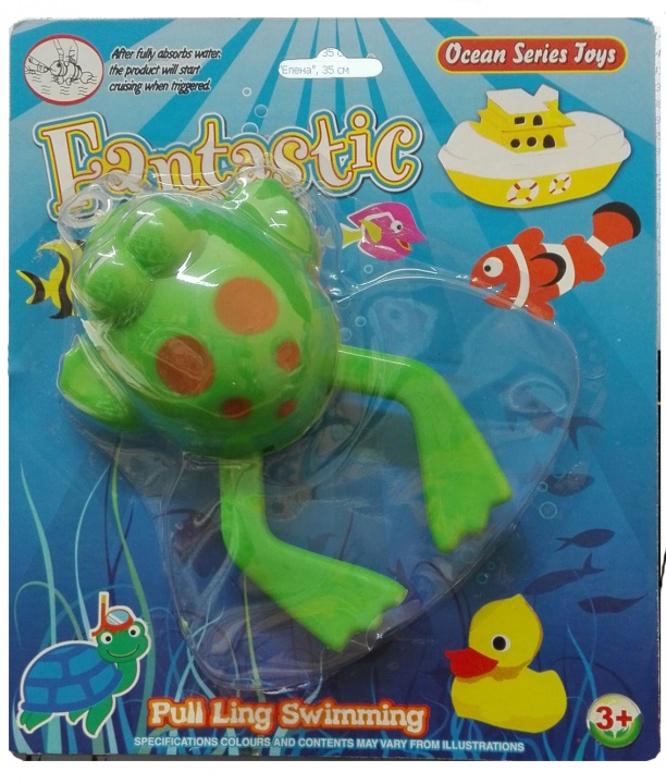 Лягушка оснащена специальным механизмом при помощи которого может плавать. На носу есть веревочка с кольцом, которая приводит в действие задние лапки, за счет этого она может плыть.