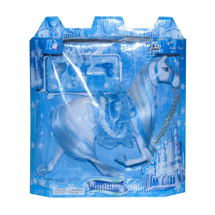 Игровой набор "Снежная лошадка" выполнен в бело-голубых тонах: белая лошадка с гривой и хвостом бело-голубого цвета, которые можно расчесывать, копыта украшены блестками, уздечка и седло голубые (можно снимать).