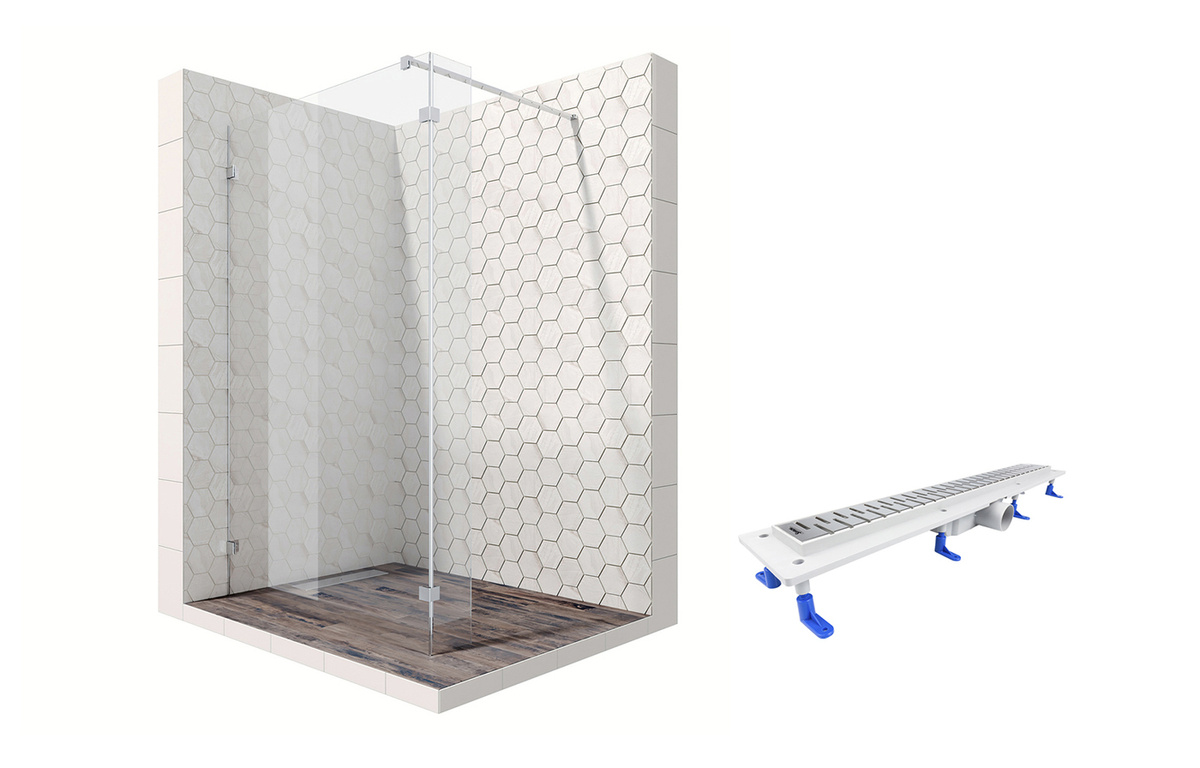 Комплект душевого ограждения (перегородка) со свободным входом с линейным трапом Ambassador Walk-in 15031106-ST16, с защитой от водяных разводов EasyClean, 100 х 25 см