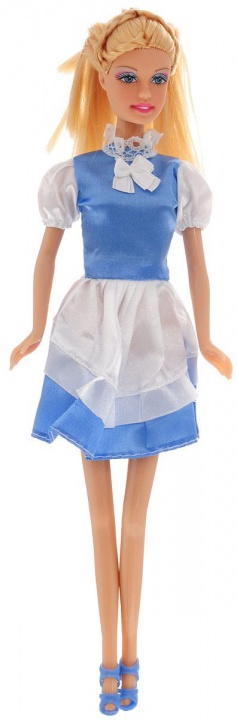 Сама куколка - настоящая красавица. Длинные светлые волосы, которые легко расчесываются, что позволит создавать дивные прически, подчеркивающие образы красотки. Макияж куколки выполнен детально и качественно, а кроме того у нее приветливое улыбающееся личико. Одета в нарядное платьице голубого цвета с воротничком.