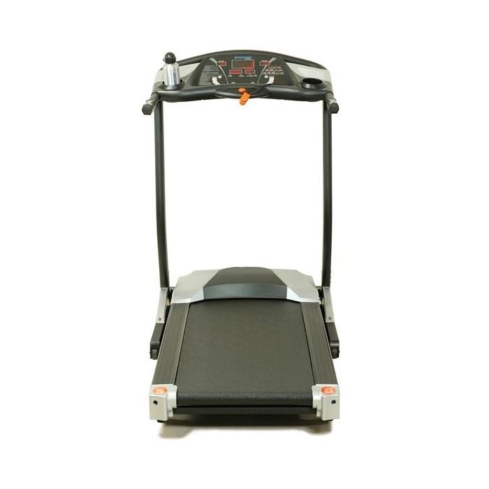 Мощность двигателя беговой дорожки Sportop ST6870 достигает 2 л.с. , а встроенная электронная система защиты от перегрузок позволяет продлить срок службы. Стальная устойчивая рама двухслойное широкое полотно способны выдержать нагрузку в 150 кг. Высокая степень амортизации основания благодаря внедренным эластомерам по периметру снижает нагрузку на тазобедренный сустав, колени и связки.