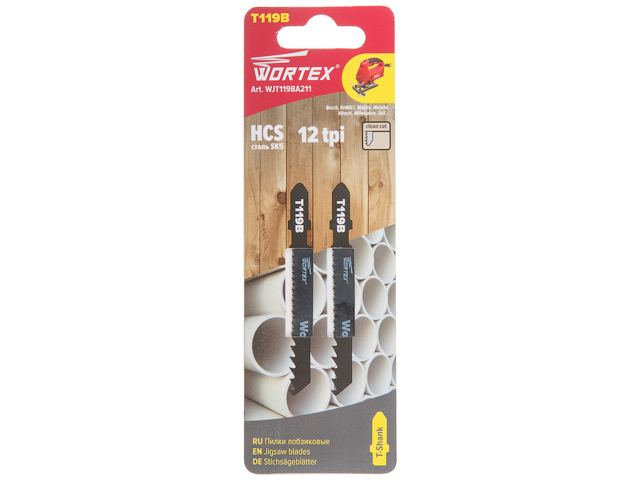 - Название и артикул Пилка лобз. по дереву T119B (2 шт.) WORTEX (пропил прямой, тонкий, для базовых работ) (WJT119BA211)