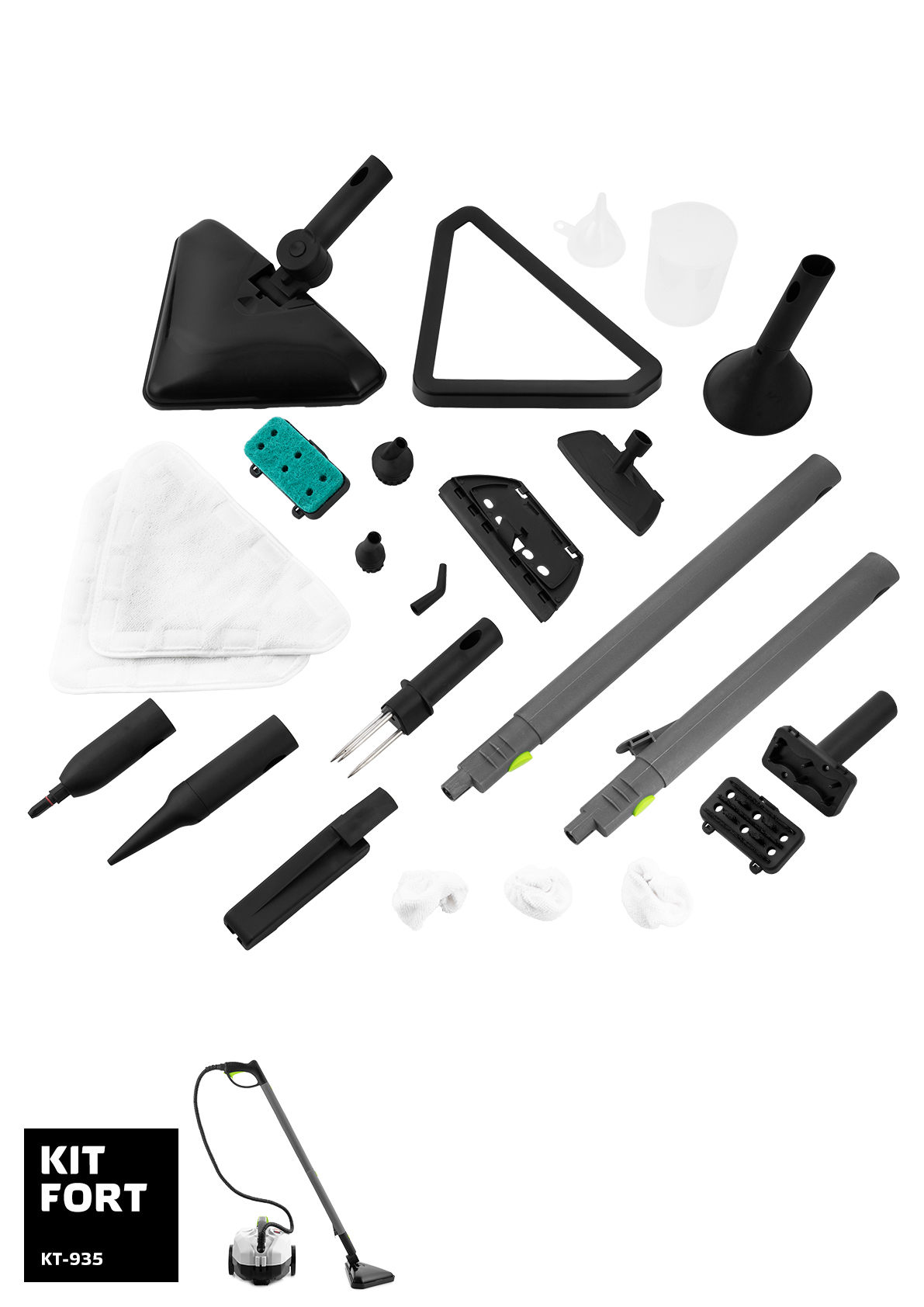 - Насадки в комплекте форсунка точечной струи,удлинительные трубки,стяжка для мойки окон,насадка для мытья полов,паровой пистолет