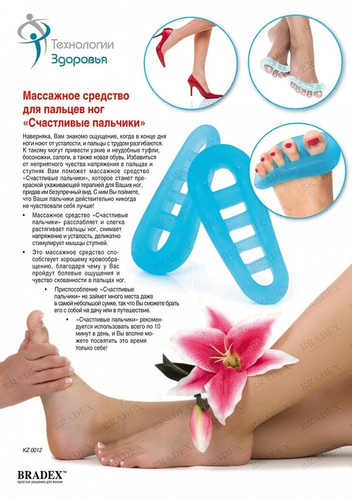ПрименениеПеред применением массажного средства «СЧАСТЛИВЫЕ ПАЛЬЧИКИ» рекомендуется вымыть ноги теплой водой с мылом. Аккуратно растягивая приспособление, засуньте туда пальцы ног и надёжно закрепите, мягко надавив на массажное средство. Противопоказания: - Запрещается применять приспособление будучи за рулем автомобиля или при ходьбе. - Не рекомендуется надевать приспособления на раздраженную, воспалённую или поврежденную кожу ступней, а также на открытую рану. - Не рекомендуется использование массажного средства при диабете или заболеваниях кровообращения: в этих случаях обязательно проконсультируйтесь со своим врачом во избежание осложнений! - Запрещается надевать обувь вместе с массажным средством. Рекомендуются основные правила соблюдения индивидуальной гигиены при применении массажного средства «СЧАСТЛИВЫЕ ПАЛЬЧИКИ». Рекомендации по уходу: Рекомендуется после каждого применения промывать приспособление с помощью воды с мылом.