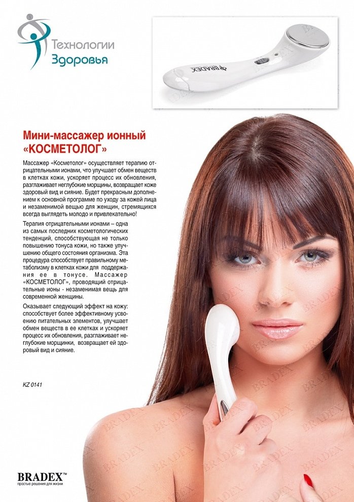 - Описание Терапия отрицательными ионами – одна из самых последних косметологических тенденций, способствующая не только повышению тонуса кожи, но также улучшению общего состояния организма. Эта процедура способствует правильному метаболизму в клетках кожи для поддержания ее в тонусе. Массажер «КОСМЕТОЛОГ», проводящий отрицательные ионы - незаменимая вещь для современной женщины. Оказывает следующий эффект на кожу: способствует более эффективному усвоению питательных элементов, улучшает обмен веществ в ее клетках и ускоряет процесс их обновления, разглаживает неглубокие морщинки, возвращает ей здоровый вид и сияние. Являясь дополнением к основной программе по уходу за кожей лица, массажер «КОСМЕТОЛОГ» поможет Вам надолго сохранить красоту и молодость!