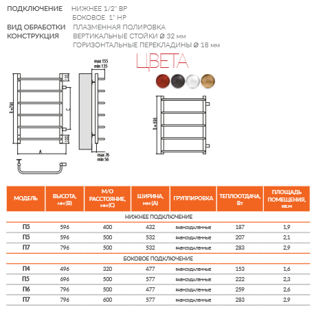 В зависимости от способа обработки поверхности полотенцесушителя выделяют хромированный, полированный, окрашенный и полимерный типы.