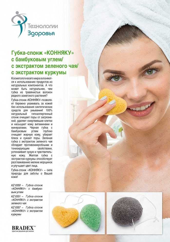 - Описание Мечтаете о чистой, свежей и гладкой и ровной коже,мечтаете отказаться от использования тонального крема? Воспользуйтесь древним методом азиатских красавиц – чисткой лица при помощи волокон редкого растения конняку с вершин местных гор. Губка-спонж «КОННЯКУ»: • бережно очищает кожу без использования косметических средств; • удаляет ороговевшие клетки лучше любого скраба; • насыщает кожу витаминами и минералами; • выравнивает тон кожи. Спонж «КОННЯКУ» с бамбуковым углем способен глубоко очищать поры от загрязнений и жира, подходит для подростков и для людей с жирной кожей, склонной к образованию прыщей, черных точек, комедонов. Губка с экстрактом зеленого чая обладает сильным тонизирующим и противовоспалительным эффектом, усиливает защитные свойства кожи, успокаивает кожу при солнечных ожогах. Подходит для сухой и чувствительной кожи. Губка с экстрактом куркумы проявляет свои бактерицидные качества и позволяет достичь эффекта легкого лифтинга, экстракт куркумы замедляет процессы старения, выравнивает цвет лица. Подходит для возрастной кожи.