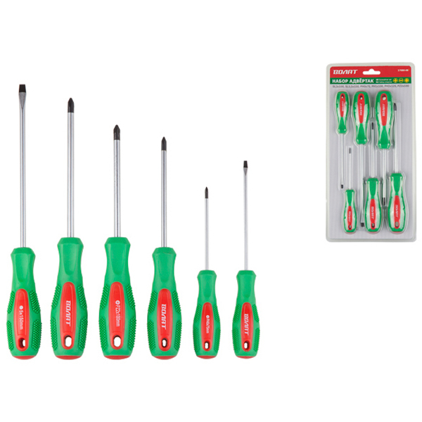 Комплект Волат 17080-06 включает в себя: отвертки плоские - SL3, SL5,5; фигурные - PH0, PH1, PH2, PZ2; Длина бит - SL3х100 мм, SL5 мм, 5х150 мм, PH0х75 мм, PH1х100 мм, PH2х125 мм, PZ2х100 мм.
