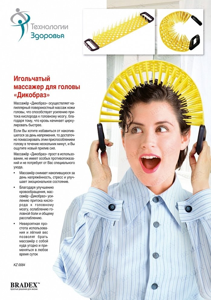 ОписаниеКаждый вечер, приходя домой, Вы валитесь с ног от усталости и переутомления? У Вас не остается сил для полноценного расслабления или домашних дел после работы? Часто страдаете от смены погоды? С помощью массажера для головы «ДИКОБРАЗ», основанном на усовершенствованном древнем методе Шиатцу, Вы сможете избавиться от всех вышеперечисленных проблем. Ни для кого не секрет, что на коже головы содержится огромное количество нервных окончаний и рецепторов, воздействие на которые способствует комплексному устранению целого ряда проблем, связанных со здоровьем. Благодаря своей уникальной конструкции, массажер «ДИКООБРАЗ» воздействует на максимально возможную область головы. Более 90 щетинок, расположенных в хаотичном порядке, помогают наиболее эффективно воздействовать на кожу головы, улучшая кровообращение. - Способствует снятию усталости, всеобщему расслаблению и повышению жизненного тонуса. Уже после первого применения Вы с удивлением заметите, как улучшает Ваше настроение и самочувствие. - Массажер «ДИКООБРАЗ» складывается самым удобным образом, что позволяет с легкостью уместить его даже в дамской сумочке или кейсе. - Яркий «позитивный» цвет приспособления благотворно повлияет на настроение и настроит на радостную ноту.