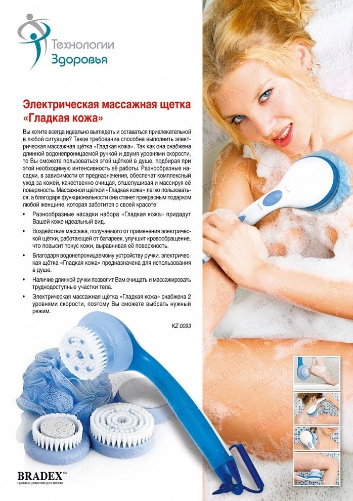 ОписаниеВаша кожа с годами стала менее упругой и эластичной? Мышцы спины и шеи, постоянно находящиеся в напряжении в течение целого дня, устают, и Вы испытываете при этом болезненные, неприятные ощущения? Стопы ног сухие и шелушатся? Избавиться от этого комплекса проблем Вы можете, посетив эксклюзивные спа-процедуры в дорогом салоне красоты или… устроить себе салон красоты прямо на дому, с помощью уникальной массажной щетки «ГЛАДКАЯ КОЖА». Мытье с такой щеткой не только гигиеническая процедура, но также массаж с косметическим эффектом, которого трудно достичь другими настолько компактными приборами. С помощью этой уникальной массажной щетки Вы сможете: - улучшить состояние кожи, увеличить ее эластичность и гладкость; - активизировать обмен веществ, улучшить кровообращение и повысить мышечный тонус; - снять стресс, усталость и эмоциональное напряжение, накопившиеся за день. Принцип работы массажной щетки «ГЛАДКАЯ КОЖА» основан на вращении насадок, которые вы подбираете под конкретные процедуры. В комплект входят целых 5 насадок, имеющих разное назначение и эффект. - Щетка имеет две скорости вращения, которые Вы можете регулировать. - В ней предусмотрен специальный контейнер для жидкого мыла, геля для душа или массажного масла, что позволяет сделать процедуру мытья более удобной и приятной. - Длинная водонепроницаемая ручка подарит Вам еще больше комфорта при использовании данного прибора, а также позволит работать даже с самыми труднодоступными местами.