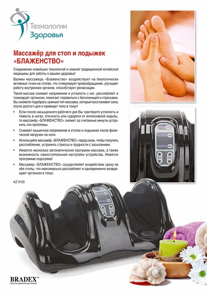 ОписаниеМассажер для стоп и лодыжек «БЛАЖЕНСТВО» - настоящий технологический прорыв в сфере массажеров! Уникальное сочетание современных технологий и древних знаний Китая о том, что на стопах расположено огромное количество акупунктурных точек, связанных со многими органами тела – основа работы данного массажера. Принцип его работы основан на том, что валики, встроенные в его платформу, воздействуют на биологически активные точки, находящиеся на стопе, за счет чего стимулируется кровообращение, и улучшается снабжение внутренних органов нужными веществами. - Если после насыщенного рабочего дня Вы чувствуете усталость и тяжесть в ногах, отечность или судороги от интенсивной ходьбы, то массажер «БЛАЖЕНСТВО» сможет за считанные минуты устранить эти проблемы. - Снимает мышечное напряжение в стопах и лодыжках после физической нагрузки на ноги. - Используйте массажер «БЛАЖЕНСТВО» перед сном, чтобы получить расслабление, устранить стрессы и трудности с засыпанием. - Имеется несколько автоматических программ массажа, а также возможность самостоятельной настройки устройства. - Массажер «БЛАЖЕНСТВО» осуществляет воздействие сразу на обе стопы, что максимально расслабляет и одновременно возвращает организм в тонус.