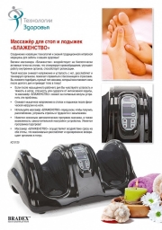 ПрименениеМассажер «БЛАЖЕНСТВО» можно использовать не только для стоп и лодыжек, но также для массажа в локтях и суставах рук. Рекомендуемая продолжительность одного сеанса массажа не должна превышать 30 минут. Способ применения: 1. Подключите массажер к сети. 2. Чтобы запустить работу массажёра, нажмите кнопку включения. 3. Настройте при помощи панели управления нужный режим работы массажера. 4. Поместите на платформы массажера ступни. 5. Во время массажа Вы можете плавно смешать ноги на платформах, чтобы получать массаж именно в той области, с которой требуется снять боль, отек, напряжение, ощущение скованности. 6. Если почувствуете дискомфорт во время сеанса, рекомендуется немедленно прекратить работу с массажером. Противопоказания: - Не используйте массажер при наличии следующих заболеваний: остеопороз, высокая температура или лихорадочное состояние, умственная отсталость, эпилепсия, заболевания сердца, нарушение кровообращения или плохая свертываемость крови, индивидуальная непереносимость материалов, из которых выполнен массажер. - Не пользуйтесь массажером во время беременности. - Настоятельно не рекомендуется использовать массажер, если у Вас имеются встроенные кардиостимуляторы, сердечные имплантаты и иные электронные аппараты, стимулирующие работу внутренних органов. Рекомендации по уходу: При загрязнении рекомендуется протирать платформу массажёра влажной тряпкой.