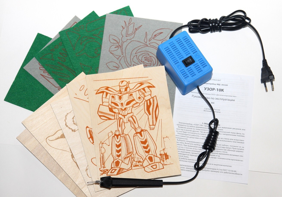 Набор для выжигания по дереву и ткани "Узор-10к" (5 досок, 5 кусков ткани) с электроприбором