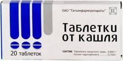 - Состав: на 1 таблетку:Активные вещества: термопсиса ланцетного травы - 0,0067 г; натрия гидрокарбоната - 0,2500 г. Вспомогательные вещества: крахмал картофельный - 0,0279 г; тальк - 0,0054 г.