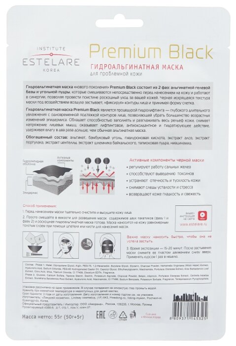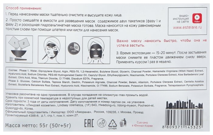 - Дополнительная информация активные ингредиенты: альгинат, бамбуковый уголь, гиалуроновая кислота, экстракт алоэ, экстракт портулака, экстракт центеллы, экстракт шлемника байкальского, тапиоковая пудра, ниацинамид