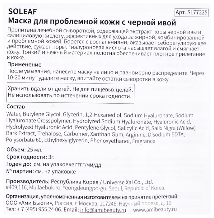 - Способ применения очистить кожу от макияжа и загрязнений, извлечь маску из упаковки и тщательно разгладить ее на лице, оставить маску на лице на 10-15 минут, затем снять маску, а оставшуюся эссенцию вмассировать в кожу