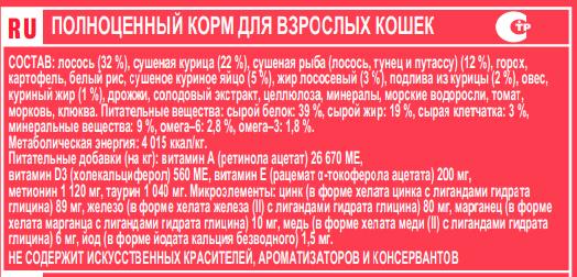 Ингредиенты: лосось 32%, сушеная курица (22%), сушеная рыба (лосось, тунец и путассу) (12%), горох, картофель, белый рис, сушеное куриной яйцо (5%), жир лососевый (3%), подлива из курицы (2%), овес, жир куриный (1%), дрожжи, солодовый экстракт, целлюлоза, минералы, морские водоросли, томат, морковь, клюква.