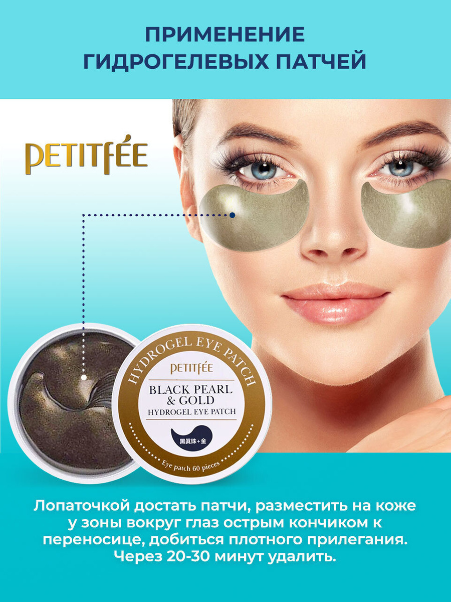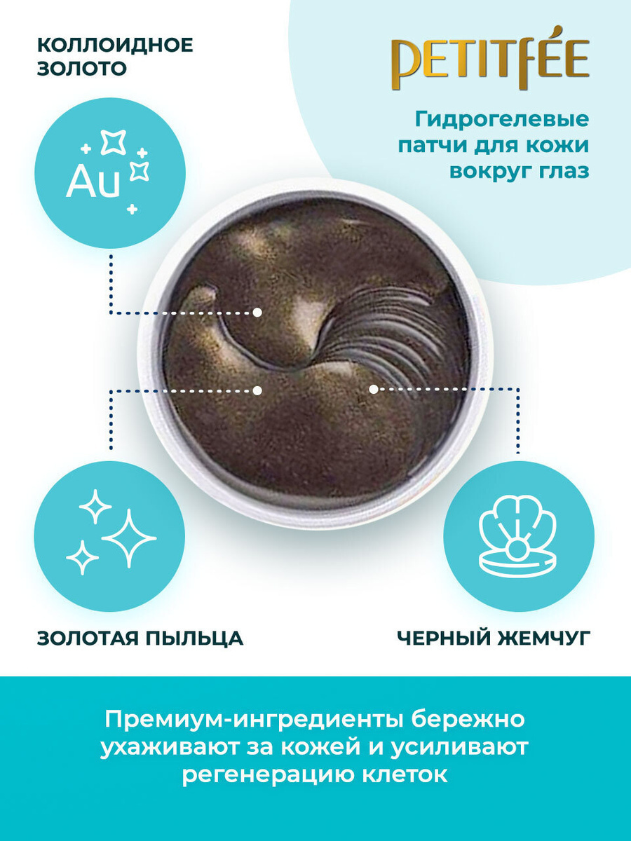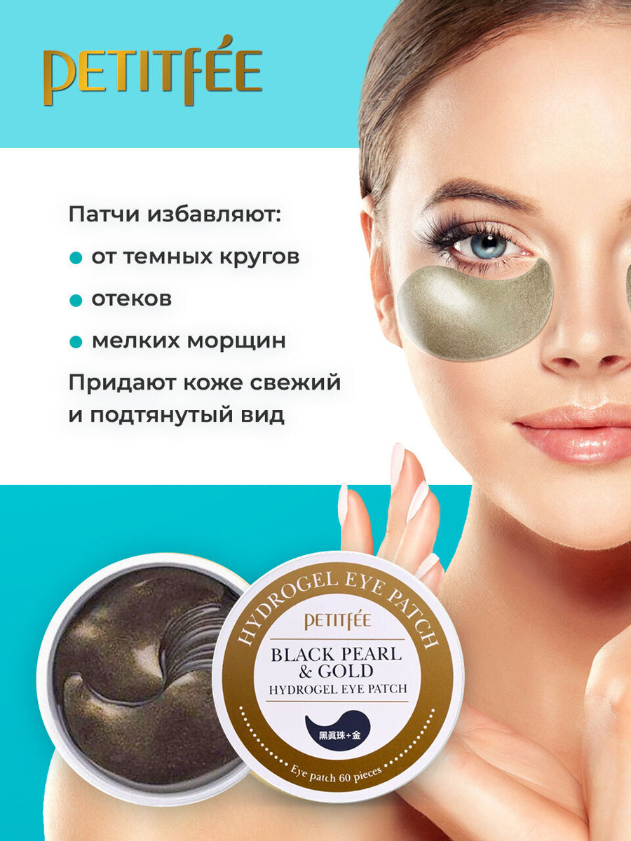 Petitfee патчи для кожи вокруг глаз гидрогелевые с пудрой черного жемчуга и золотом, PETITFEE Black Pearl & Gold Eye Patch, 60шт