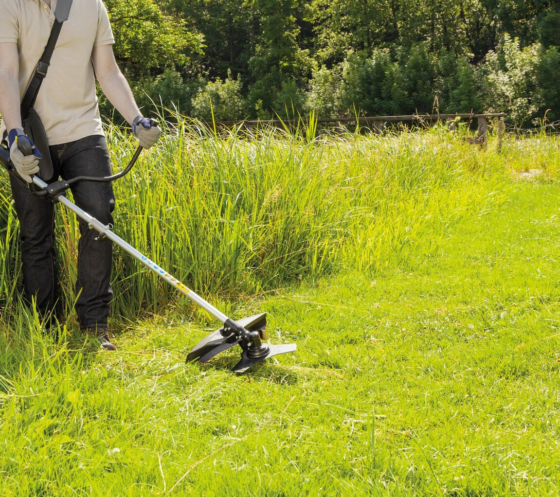 В комплект косы входят леска и режущий нож. Как леска, так и нож могут быть использованы, как режущие элементы. Нож приспособлен для выполнения более сложных задач. При замене лески на нож срез большого кустарника или поросли деревьев пройдет быстро и легко. Ширина обработки ножом — 230 мм. Нож оснащен тремя стальными лопастями, что гарантирует силу и точность среза. При правильной установке на ведомом диске, нож владеет высокой мощностью. Он с легкостью рубит даже нетолстые деревянные стволы.