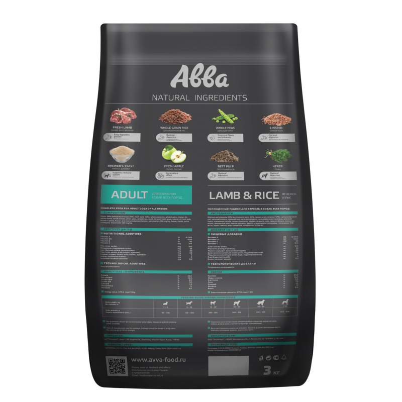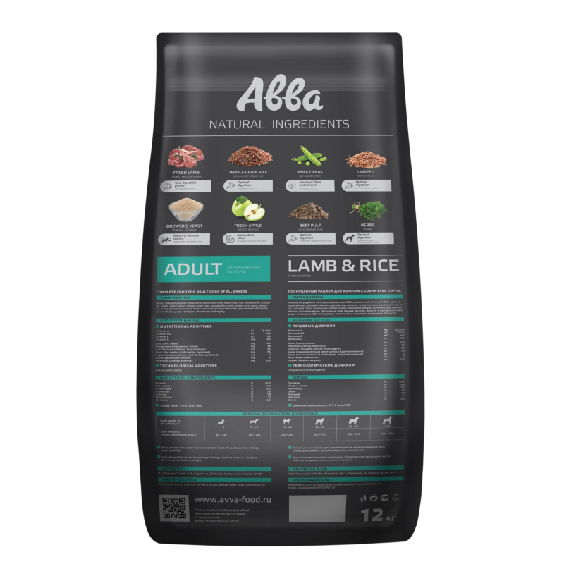 Авва Natural Ingredients корм сухой для взрослых собак с ягненком и рисом 3кг 12 кг