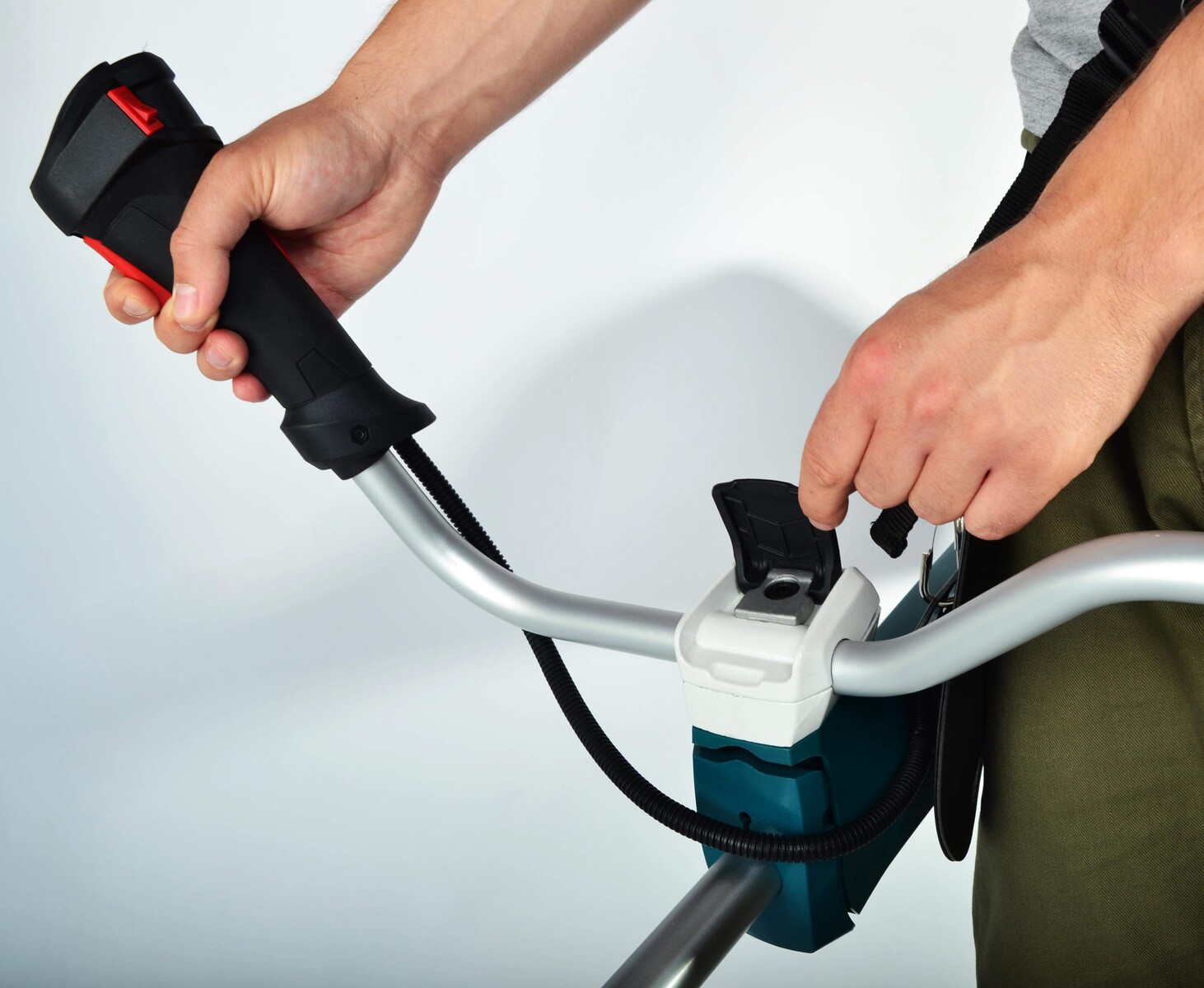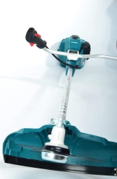 Обе ручки управления имеют резиновые накладки, которые помогают осуществлять плотный захват без проскальзывания рук. Уверенное управление помогает сохранить полный контроль за инструментом и режущими блоками. На ручке находится кнопка блокирующая самопроизвольный запуск двигателя.