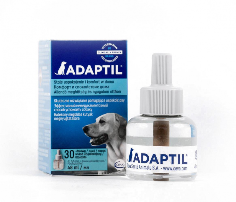 Adaptil рекомендован ветеринарными врачами в качестве успокаивающего средства для собак, благотворно влияющего на поведение питомца. Препарат представляет собой смесь феромонов, присущих лактирующим сукам.