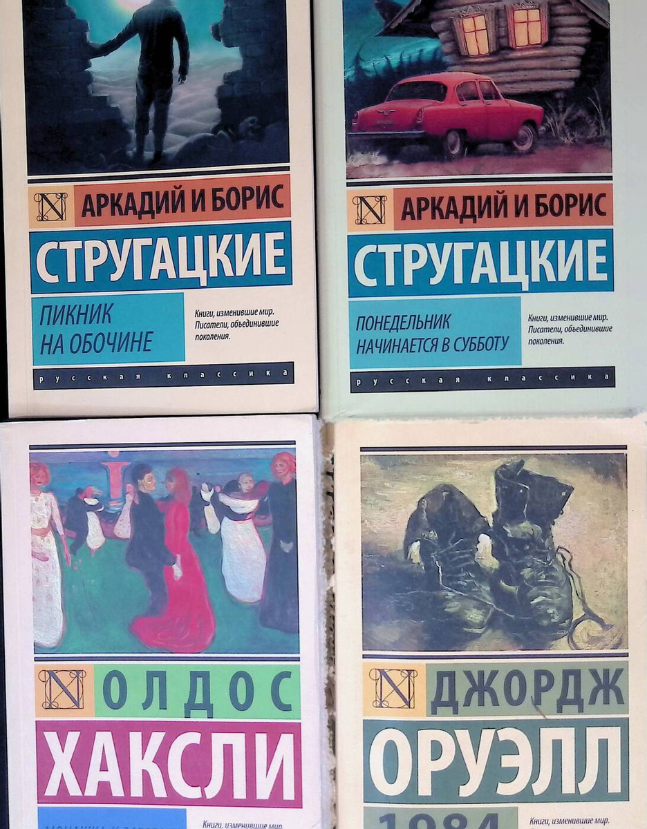 - Автор на обложке Джордж Оруэлл, Олдос Хаксли, Аркадий и Борис Стругацкие