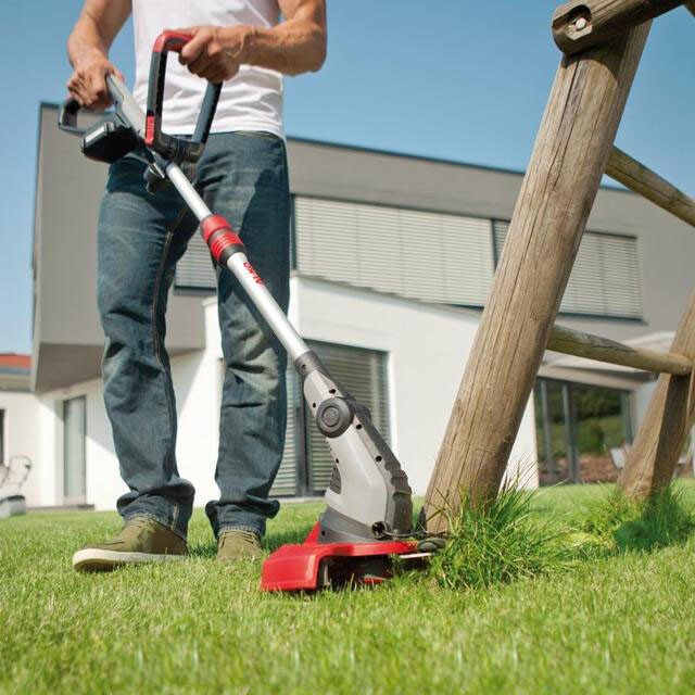 Срез травы выполняется с помощью режущей катушки, в которой заправлена тонкая (диаметр лески равен 1,6 мм), но прочная нейлоновая двойная леска. Такой режущий элемент идеально срезает стебли, при этом безопасен в случае контакта с твердыми камнями или деревом. Ширина полосы подстригания за один проход охватывает 25 см, что значительно увеличивает производительность и эффективность работы инструмента. Подача лески происходит путем нажатия режущей катушки об землю, во время чего встроенным ножом отрезается использованная леска.