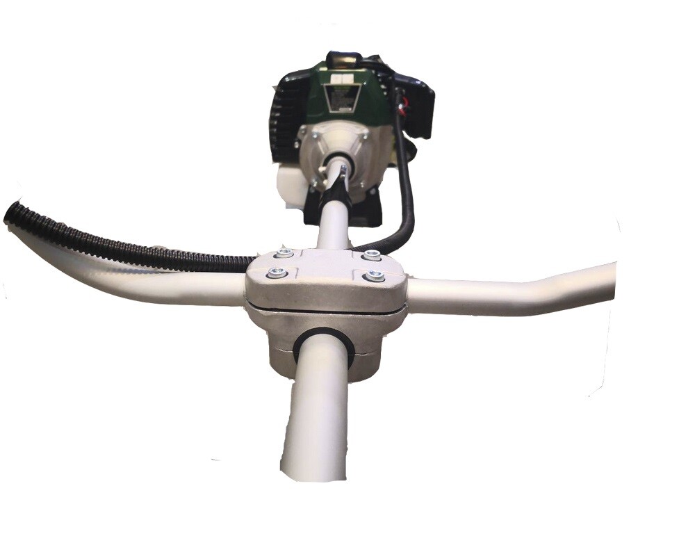 Специальный фиксатор из прочного сплава гарантирует хорошую фиксацию руля без свободного хода. Жесткая сцепка необходима для монолитности конструкции, за счет чего агрегатом удобно косить, осуществляя широкий размах для захвата широкой полосы.