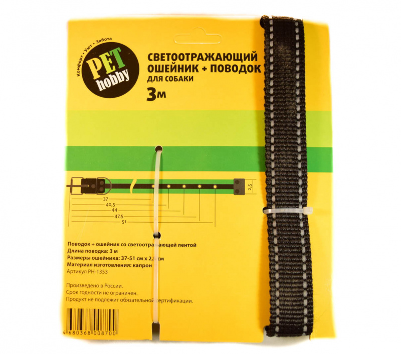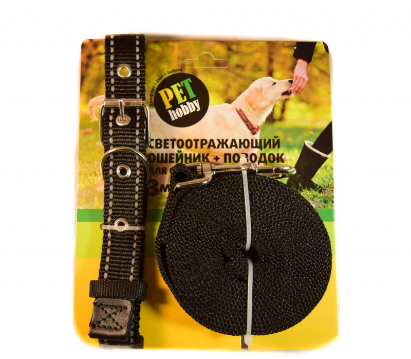 Комплект поводок+ошейник производится торговой маркой PETHOBBY для комфортного времяпровождения с любимцем на свежем воздухе. Изготовлен из качественного капрона, он не порвется даже от резких рывков собаки, не причиняет дискомфорта шее. Ошейник оснащен удобным фиксатором, который регулируется по длине и легко надевается.