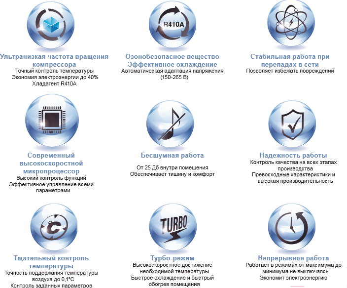 • Режим работы охлаждение, обогрев, вентиляция, осушение, сон (тишина)